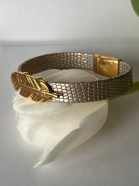 Sort flettet skinnarmbånd med gulldetaljer. Gullbelagt fjær
