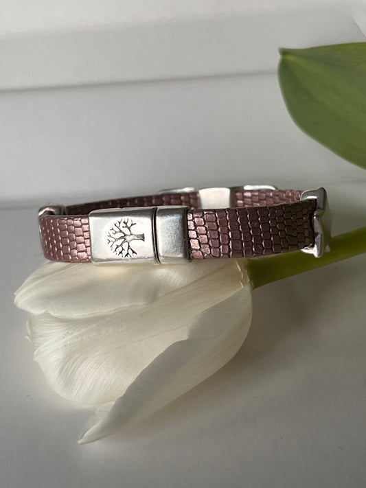 Rosa metallic armbånd med sølvdetaljer og magnetlås