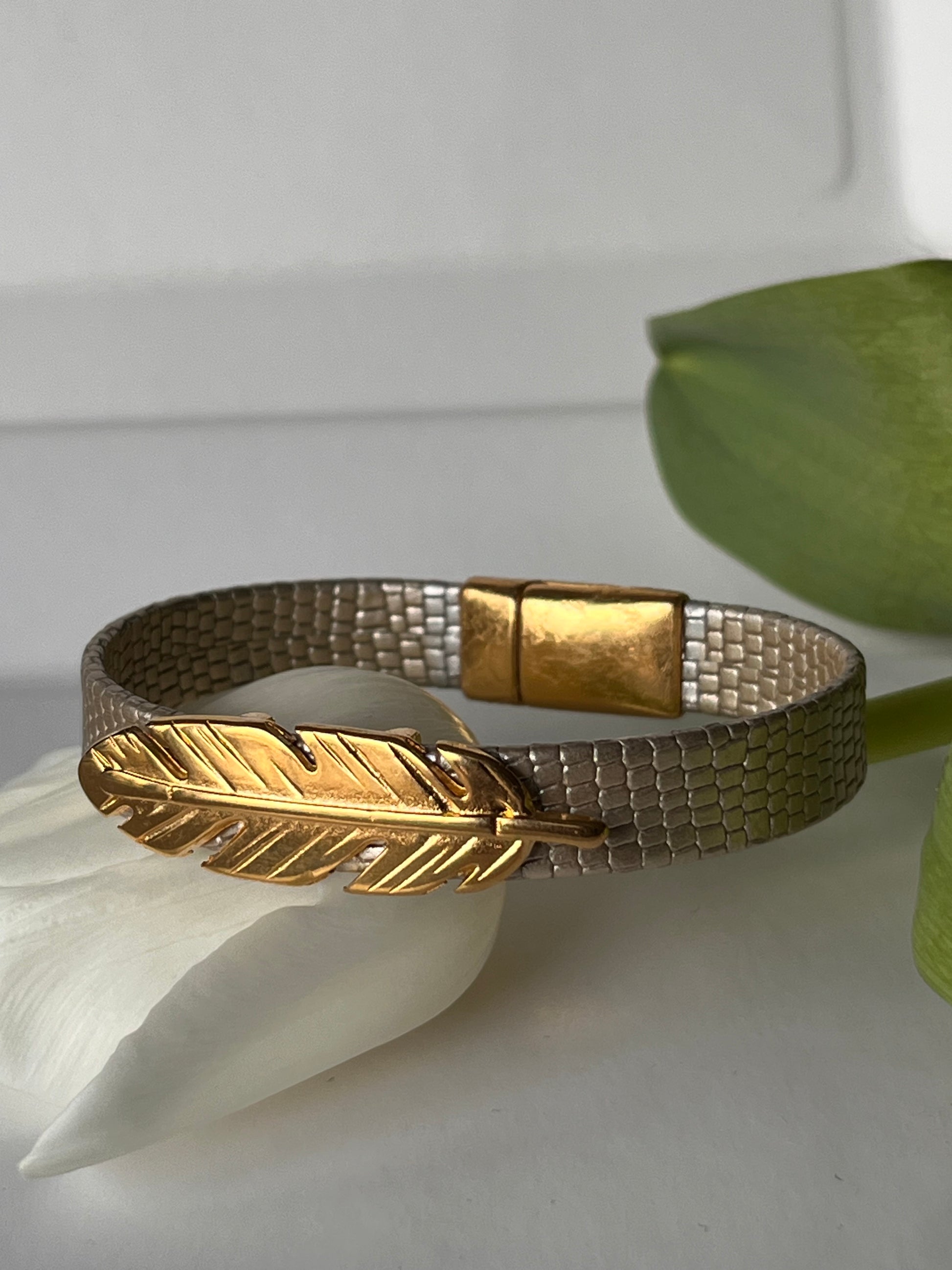 Rosa metallic armbånd med gullfjær - vi bare digger fjær!